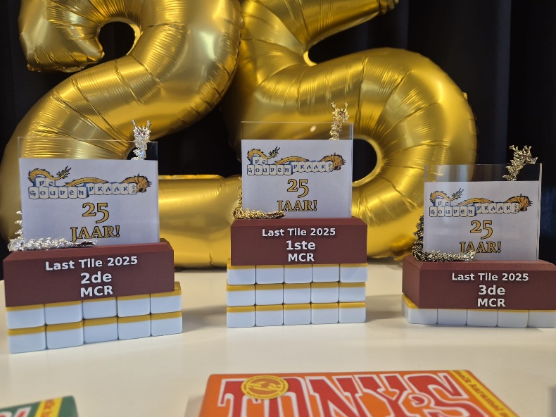 Peter van de Smitte behaalde als laatste een mahjong met de laatste steen (Last tile drawn/ discard) en mocht met de speciale prijs naar huis. Iddy Oort bewees dat je ook met een matige start nog hoog kan eindigen. Na twee rondes had ze pas drie tafelpunten verzameld. Zij stoomde echter als een diesel in de laatste twee rondes door en eindigde op een verdienstelijke vierde plek met 11 tafelpunten. Het is duidelijk dat op het Last Tile toernooi je maar beter het beste tot het laatst kan bewaren.